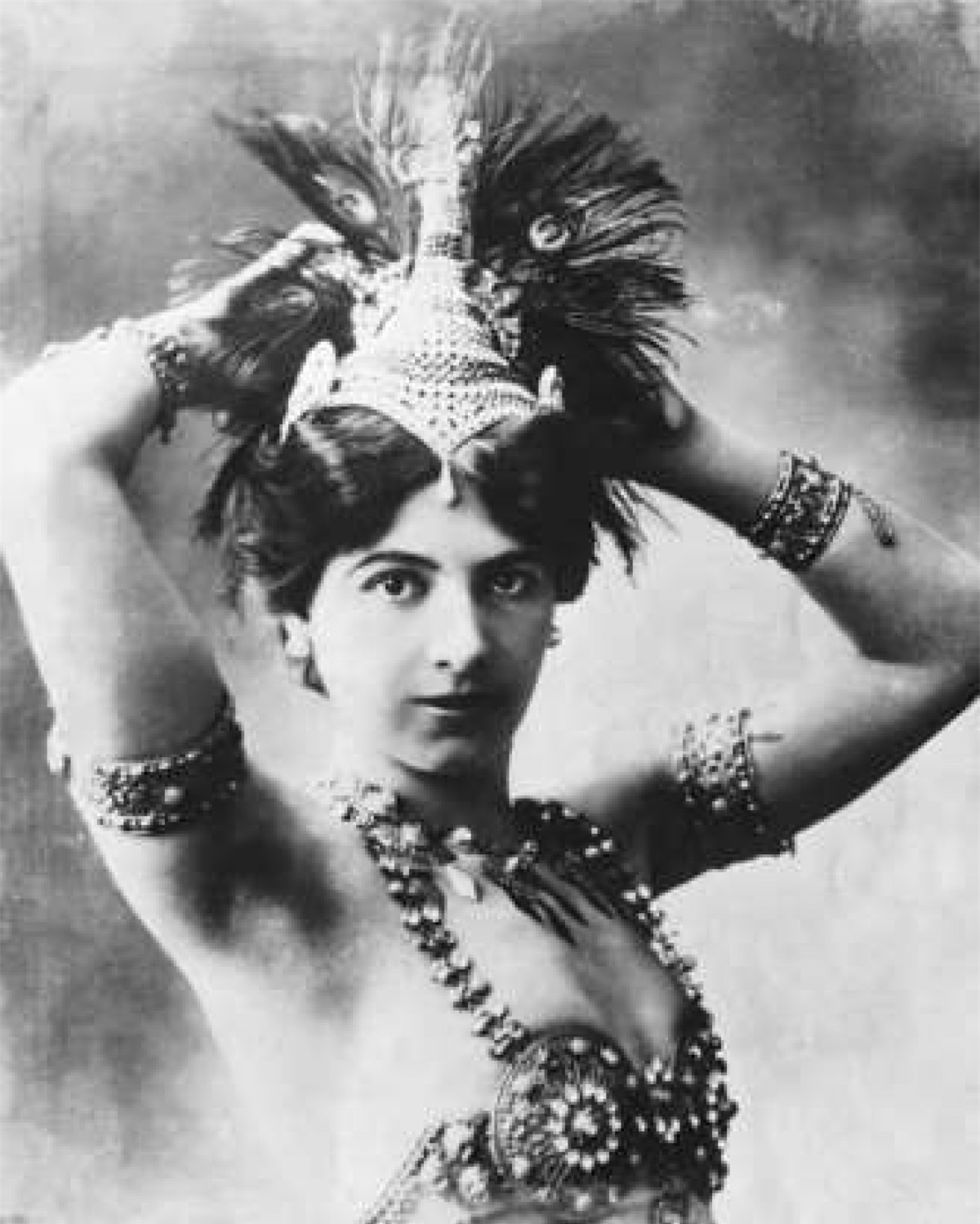 Mata Hari (1876–1917): Mata Hari, sinh ra tại thị trấn Leyvarden ở Hà Lan, là một vũ nữ nổi tiếng khắp Paris hoa lệ với những điệu nhảy tốn nhiều giấy mực của các nhà phê bình nghệ thuật. Trong suốt Thế chiến I, Mata Hari được cho là có nhiệm vụ thu thập tin tức có liên quan đến hoạt động quân sự của Pháp ở Paris và các khu vực chiến lược quan trọng rồi thông báo cho cơ quan tình báo Đức. Năm 1917, cô bị Pháp xử bắn và qua đời ở tuổi 41.