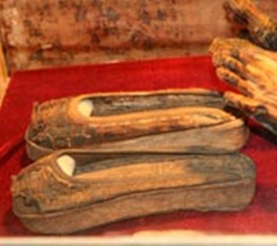 Đôi hài còn lại đặt cạnh chân của bà Hiệu được làm bằng chất liệu rất tốt, có khả năng là một loại bố tơ tằm. Trên thân hài, được trang trí bằng những sợi vàng mỏng, đính vào nhau tạo thành hình bông cúc, được kết lại bằng những dây bện bằng vàng mỏng.