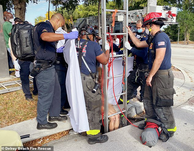 Những bức ảnh do lực lượng cứu hỏa và cứu hộ Delray Beach cho thấy, nhân viên cứu hỏa dùng một chiếc thang và dây buộc để đưa người phụ nữ lên khỏi cống thoát nước. Họ cũng dùng khăn trắng để che cho người phụ nữ khỏa thân. Nạn nhân yếu tới mức không thể tự đứng dậy.