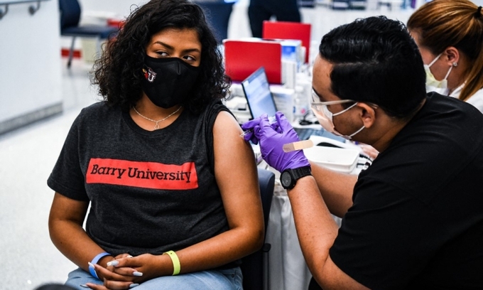 Một người dân Mỹ tiêm vaccine Covid-19 tại trung tâm y tế ở Miami, Florida, hôm 15/4. Ảnh: AFP.