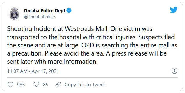 Theo Sở Cảnh sát Omaha, vụ nổ súng xảy ra bên ngoài JCPenney, và một người đàn ông bị trúng đạn đã thiệt mạng tại bệnh viện. Trung úy Neal Bonacci cho biết một phụ nữ khoảng 20 tuổi đã bị thương từ vụ nổ súng nhưng không nguy hiểm đến tính mạng.