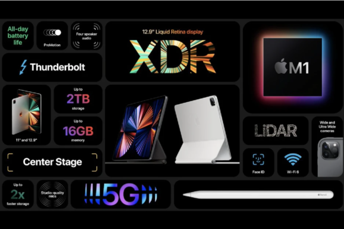 Về ngoại hình, iPad Pro 2021 không khác nhiều so với bản tiền nhiệm. Máy vẫn dùng chất liệu nhôm với hai màu cơ bản: xám và bạc. Thay đổi đáng chú ý nhất là chip M1 với khả năng xử lý đồ họa nhanh hơn gấp 1.500 lần so với bản tiền nhiệm. Phiên bản 12,9 inch, dùng công nghệ màn hình mới tên Liquid Retina XDR, với hơn 10.000 đèn LED siêu nhỏ đặt bên dưới màn hình, tạo ra các vùng sáng độc lập tương tự màn hình OLED, giúp tăng độ tương phản và độ sáng.
