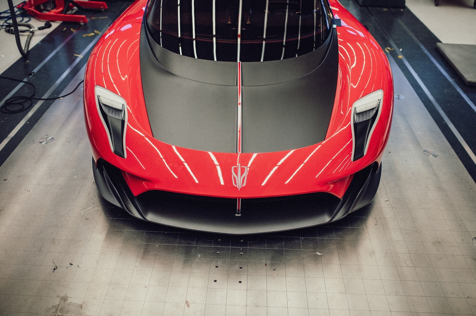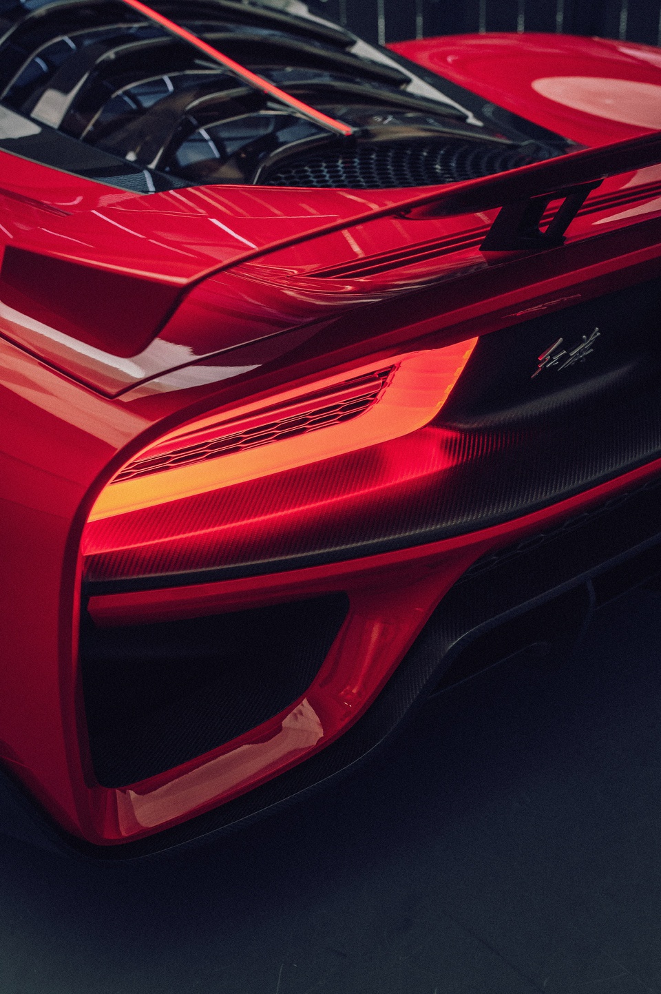 Phần đuôi dài với cánh gió sau có thể tự điều chỉnh theo tốc độ, các cửa gió được bố trí xung quanh đèn hậu dạng LED. Lưới tản nhiệt phía trước được làm từ sợi carbon.