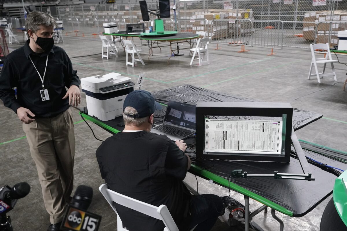 Thiết bị quét lá phiếu được thiết lập bởi Cyber Ninjas, một công ty tư vấn có trụ sở tại Florida, giám sát cuộc kiểm toán tại Đấu trường Tưởng niệm Cựu chiến binh Arizona ở Phoenix, vào ngày 22 tháng 4 năm 2021. (Ross D. Franklin / Ảnh AP)
