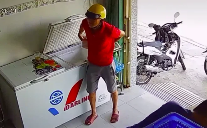 Toàn bộ diễn biến sự việc đã được camera an ninh của cửa hàng hải sản ghi lại. Theo đó, người đàn ông mặc áo đỏ đứng dựa lưng vào chiếc tủ đông lạnh. Khi thấy chủ cửa hàng không chú ý, người này cầm một khay cá đông lạnh từ từ nhét vào trong quần rồi định rời đi.