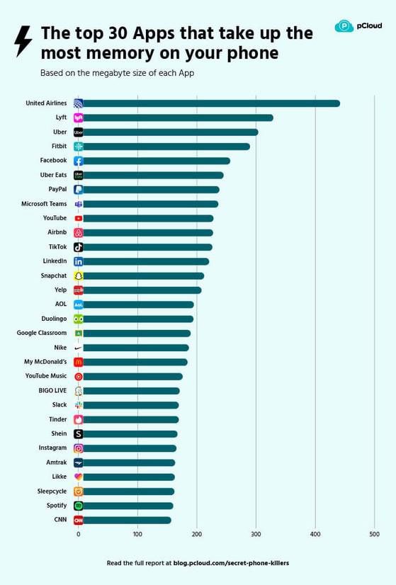 Ba ứng dụng chiếm rất nhiều dung lượng lưu trữ trên điện thoại là United Airlines (437,8 MB), Lyft (325,1 MB) và Uber (299,6 MB), đều là những ứng dụng du lịch.