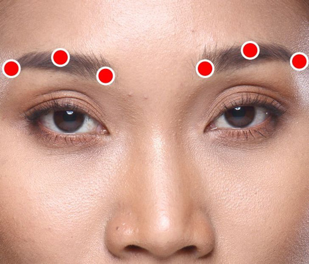 Shiatsu cũng giúp xóa nếp nhăn giữa lông mày của bạn. Tất cả những gì bạn cần làm là đặt ngón trỏ, ngón giữa và ngón đeo nhẫn vào 3 dấu chấm như hình dưới. Nhấn vào vị trí đó trong 5 đến 7 giây, sau đó lặp lại một lần nữa.