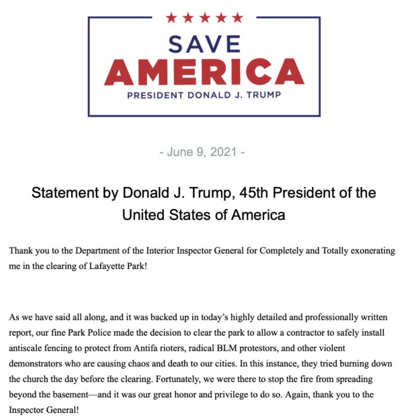 Tổng Thanh tra Bộ Nội vụ Mark Greenblatt, do Trump đề cử, gọi các sự kiện ngày 1 tháng 6 là "một sự kiện đặc biệt gây xôn xao trong một thời gian hỗn loạn" và cho biết đánh giá của họ xem xét lý do tại sao Cảnh sát Công viên Hoa Kỳ quyết định dọn dẹp Quảng trường Lafayette khi và theo cách họ đã làm , và liệu kế hoạch ra khỏi Nhà Trắng của tổng thống có ảnh hưởng đến những quyết định đó hay không. Cuộc rà soát cuối cùng cho thấy cảnh sát công viên đã lên kế hoạch dọn dẹp khu vực trong nhiều ngày để lắp đặt hàng rào chống quy mô và các quyết định trên thực tế không bị thay đổi vì kế hoạch của tổng thống hoặc Nhà Trắng.
