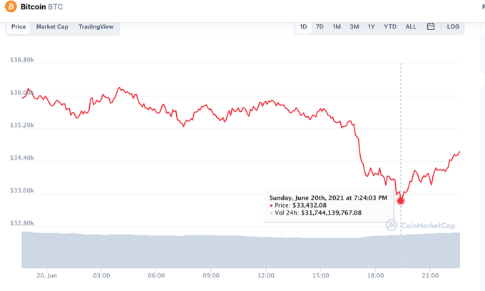 Giá Bitcoin có thời điểm giảm xuống dưới 33.500 USD hôm 20/6 - mức thấp nhất 1 tuần. Ảnh: Coinmarketcap.