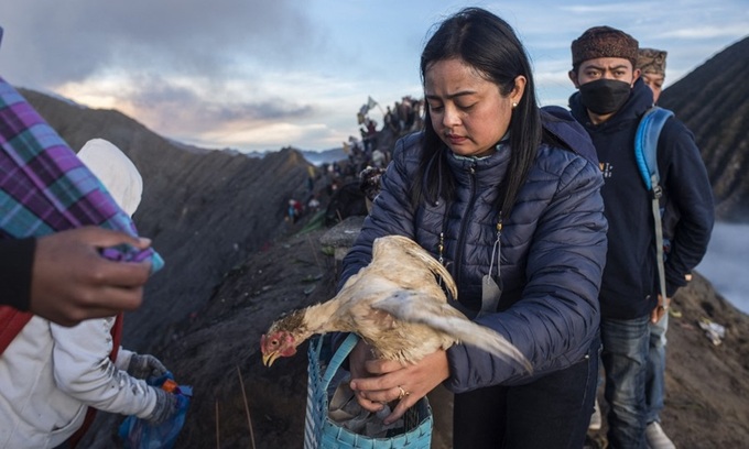 Một thành viên bộ tộc Tengger chuẩn bị ném con gà hiến tế vào miệng núi lửa Mount Bromo đang hoạt động ở tỉnh Đông Java hôm nay. Ảnh: AFP.