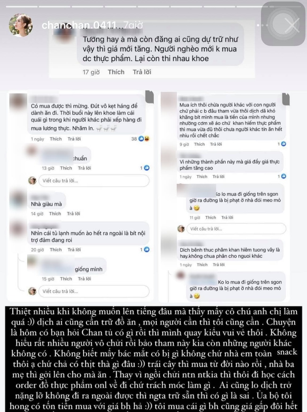 Xoài Non mới đây đã khoe hình ảnh tích trữ đồ ăn của cả gia đình. Sau đó, nhiều ý kiến trái chiều đã được đưa ra khiến việc này trở thành chủ đề bàn tán. Nhiều người cho rằng cô ích kỉ khi tích quá nhiều đồ ăn và...không nghĩ đến những người khác.