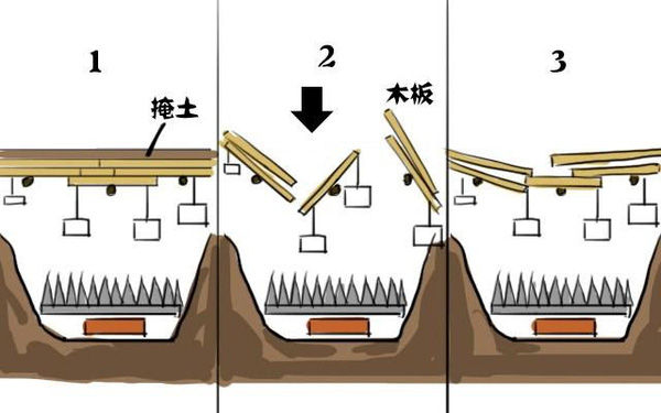Loại tấm lật này có cơ chế hoạt động tương tự nhưng trong những bộ phim truyền hình thường thấy hiện nay. Mặt trên những tấm phản gỗ được rải một lớp cát, bên dưới đào một chiếc hố lớn chứa đầy những thanh đao sắc nhọn dựng đứng. Không chỉ vậy, trên mỗi lưỡi đao đều tẩm chất kịch độc. Một khi đã rơi xuống hố sẽ bị dao kiếm đâm xuyên qua da thịt, chất độc thấm vào xương tủy mà chết đi. Hơn nữa sau khi tấm gỗ lật xuống sẽ lập tức trở lại trạng thái ban đầu, chờ đợi những người tiếp theo rơi xuống.