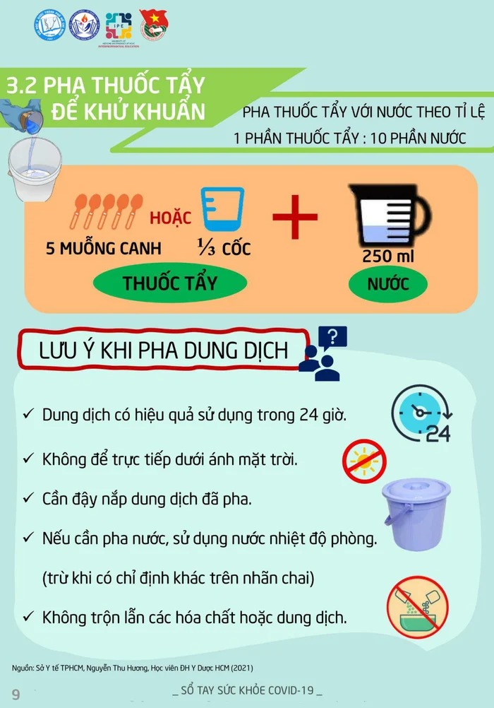 Theo Thanh niên đưa tin, mới đây, Đại học Y dược TP.HCM đã xây dựng bộ infographic mang tên sSổ tay sức khỏe Covid-19 trong đó có hướng dẫn cách pha dung dịch khử khẩn nhà cửa trong các trường hợp có F0 và không có F0. Cụ thể:
