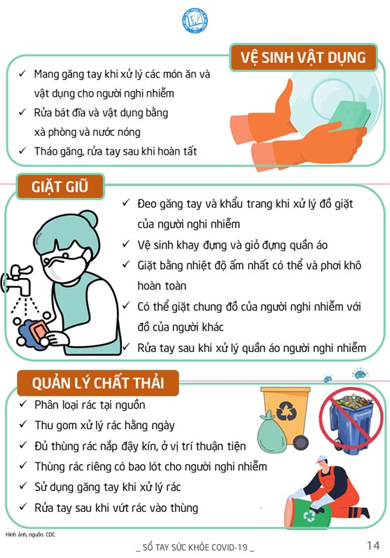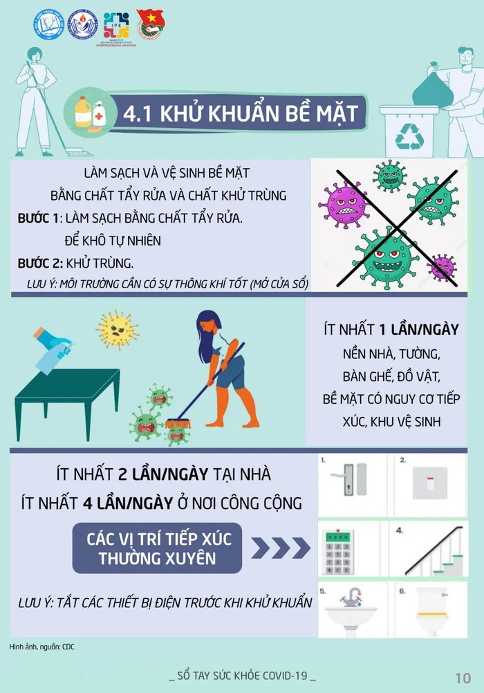 Trong Sổ tay có hướng dẫn cách khử khuẩn bề mặt, môi trường. Cụ thể, làm sạch, vệ sinh bề mặt bằng chất tẩy rửa và chất khử trùng: