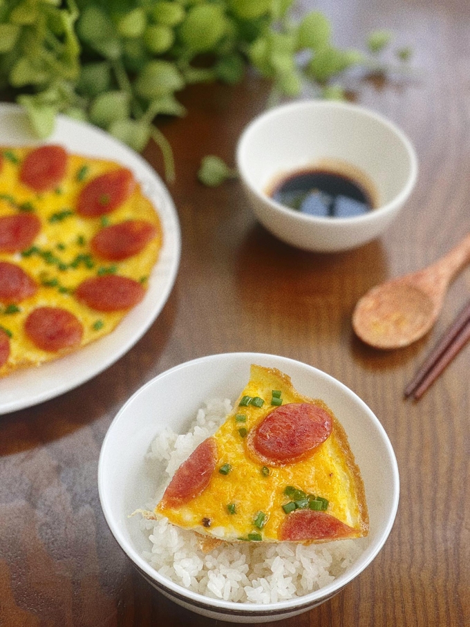 Phần trứng chiên vừa chín tới, vẫn giữ được độ mướt và béo ngậy, lạp xưởng ngòn ngọt thơm bùi, ăn với cơm nóng cùng chén nước tương tỏi ớt.