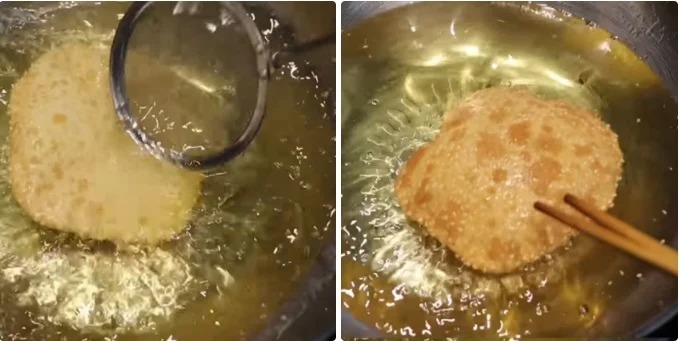 - Hạ lửa nhỏ xuống và cho bánh đã cán mỏng vào. Khi bánh nổi lên bạn dùng vá đẩy, nhúng và xoay tròn bánh thật đều tay trong khoảng 3 – 4 phút để bánh nở đều. Trở mặt bánh liên tục khoảng 1 phút để 2 mặt vàng đều rồi vớt ra. Làm liên tục cho đến khi hết bột.