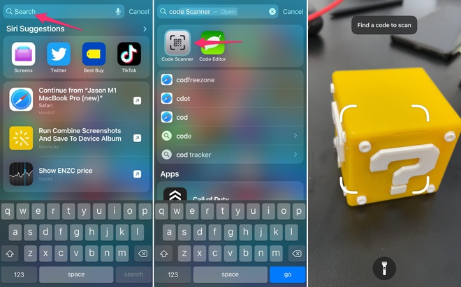 Sau đó, chỉ cần nhập từ khoá “Code” hoặc “Scanner” là ngay lập tức bạn sẽ thấy biểu tượng của ứng dụng Máy quét mă (Code Scanner) hiển thị dưới phần đề xuất. Chỉ cần nhấn vào biểu tượng là bạn có thể quét mă thành công.