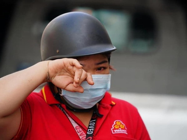 Chị Ngọc Minh (nhân viên Vissan) c̣n mặc chiếc áo đồng phục đỏ, đeo thẻ nhân viên vội vàng chạy từ Q.1 sang Q.Phú Nhuận. Khi bị trật tự đô thị yêu cầu dừng xe, chị Minh giải thích do nhà có công chuyện nên phải vội vàng chạy về.