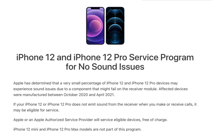 Thông báo được Apple phát hành trên trang chủ cho biết "một tỷ lệ rất nhỏ" iPhone 12 và iPhone 12 Pro gặp sự cố âm thanh. "Nếu thiết bị của bạn không phát ra âm thanh từ bộ thu khi thực hiện hoặc nhận cuộc gọi, hãy đem chúng đến dịch vụ sửa chữa. Tất cả sẽ miễn phí", Apple thông báo.
