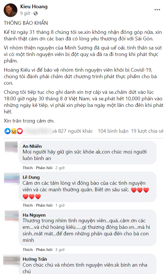 "Hoàng Kiều vì để bảo vệ nhóm tình nguyện viên khỏi bị Covid-19, chúng tôi đành phải chấm dứt chương trình phát thực phẩm cho bà con.