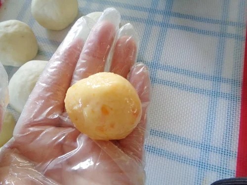 Vỏ bột bánh cán mỏng rồi đặt nhân kim sa vào giữa rồi vo tròn lại. Đặt bánh lên miếng giấy nến nhỏ. Làm cho đến khi hết bột và nhân.