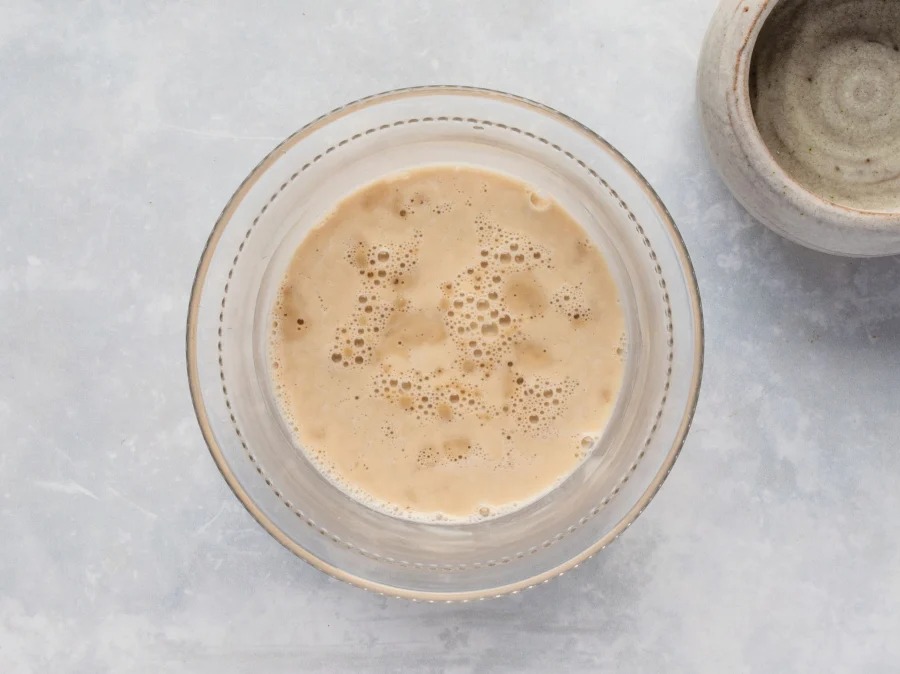 Chuẩn bị nước ấm hoặc sữa ấm khoảng 35 độ, cho đường vào hòa tan rồi thêm men. Khuấy đều và để khoảng 5 phút.