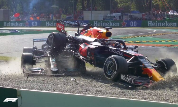Vụ tai nạn xảy ra ở vòng 26, khi Verstappen tiếp cận Variante del Rettifilo - góc cua gắt nổi tiếng trên trường đua lừng danh Monza - ở tốc độ hơn 300km/h, còn Hamilton thì ra khỏi pit-lane. Verstappen phanh trễ và cố lách vào trong góc cua để vượt Hamilton. Hai xe va chạm nhẹ, và cùng với việc bị vướng vào gờ chắn bên phải góc cua, chiếc RB16B vọt lên, lao chéo qua xe của Hamilton. Lốp sau bên phải của chiếc RB16B nằm ngay trên đầu Hamilton, và chỉ bị chặn lại nhờ sự có mặt của HALO.