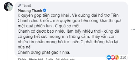 Phương Thanh cũng chia sẻ lý do không kêu gọi quyên góp. Cụ thể, giọng ca Trống vắng bày tỏ: "Không quyên góp tiền công khai. Về đường dài hỗ trợ tiền Chanh chịu không nổi, mà quyên góp tiền công khai thì quá mệt, quá phiền luôn. Chanh quá sợ mệt. Chanh có được bao nhiêu làm bấy nhiêu thôi, cũng đã cố gắng hết sức momg mọi người thông cảm. Thấy vẫn còn nhiều tin nhắn mong hỗ trợ nên Chanh phải thông báo lại nữa nè. Chanh dừng phát gạo rồi nha".