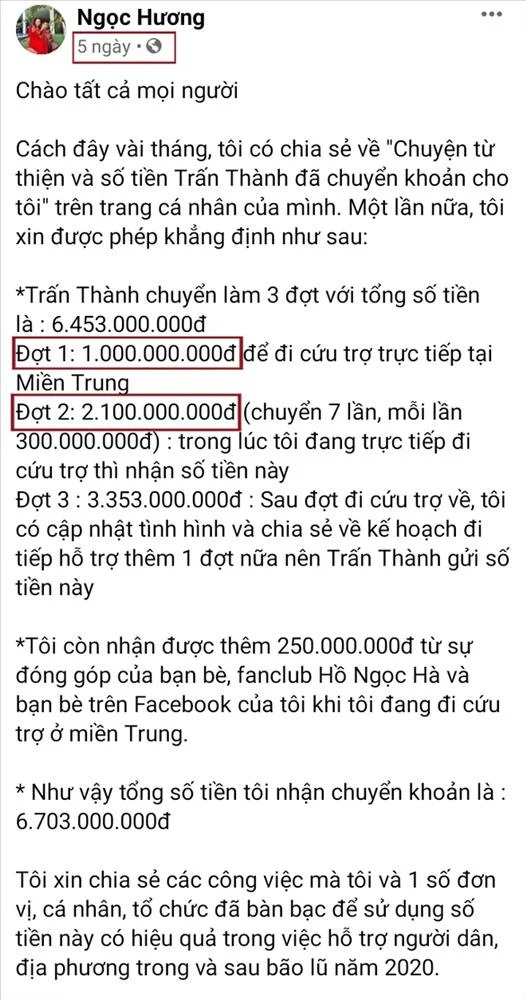 Hôm 13/9, dân mạng soi ra chi tiết bất cập về số tiền mà mẹ Hồ Ngọc Hà nhận được từ nam MC đình đám. Cụ thể stastus mẹ Hồ Ngọc Hà cập nhật ngày 1/11/2020, mẹ Hồ Ngọc Hà cho biết số tiền đợt 2 mà Trấn Thành gửi cho bà là tròn 2 tỷ đồng. Nhưng sau khi Trấn Thành công khai sao kê tiền từ thiện (ngày 7/9/2021) thì mẹ Hồ Ngọc Hà có động thái xác nhận và số tiền đợt hai nhận được từ nam MC là 2 tỷ 100 triệu đồng. Chính sự trước sau không đồng nhất này khiến nhiều netizen đặt nhiều thắc mắc cho Trấn Thành và mẹ Hồ Ngọc Hà.