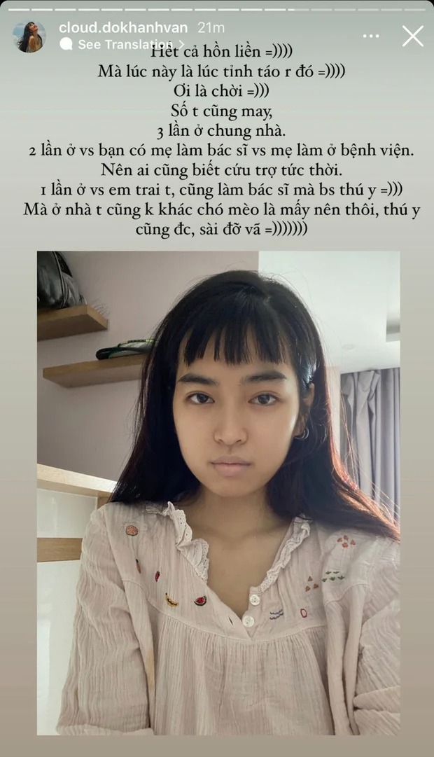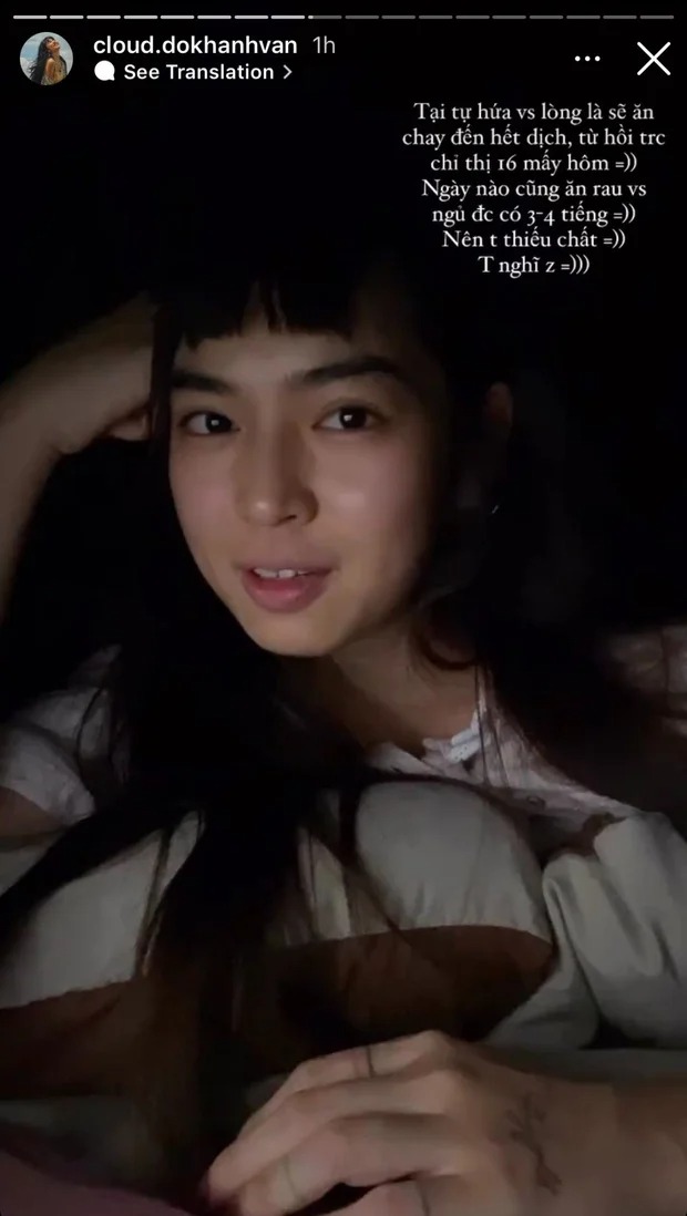 Khánh Vân cho biết đây là khoảnh khắc lúc cô vừa tỉnh táo trở lại, mới vượt qua cơn chóng mặt và mệt mỏi. Cô tiết lộ một trong những lí do cô đột nhiên đổ bệnh là vì ngày nào cũng ngủ rất ít và chỉ ăn rau dẫn tới thiếu chất trầm trọng. Đây là thói quen không tốt của rất nhiều người hiện nay nên cô cũng mong khán giả cần chú ý giữ gìn sức khoẻ trong mùa dịch.