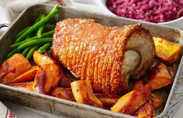 Rải ít muối bột lên lớp bì và cho thịt vào khay lồng lưới của nồi chiên không dầu, rồi cho quay với nhiệt độ 180oC trong 45 phút. Sau 45 phút, bạn lấy miếng thịt ra và bỏ hết muối trên mặt da rồi tiếp tục cho vào nồi để quay tiếp ở nhiệt độ 200oC trong 10 phút.