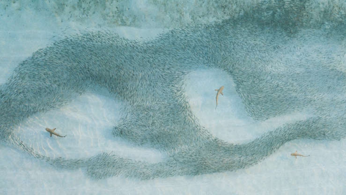 Cảnh tượng cá mập vây đen săn mồi trong bức ảnh từ trên cao đầy ấn tượng.