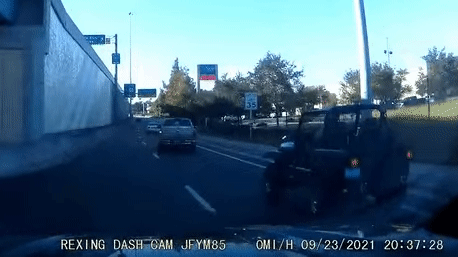 Đúng lúc, xe Jeep giảm tốc để nhường đường cho một chiếc xe con khác di chuyển từ trong ngách ra, khiến cho khoảng cách giữa hai xe càng hẹp hơn. Kết quả xe Nissan húc vào đít xe Jeep bị lật ngửa ra đường.