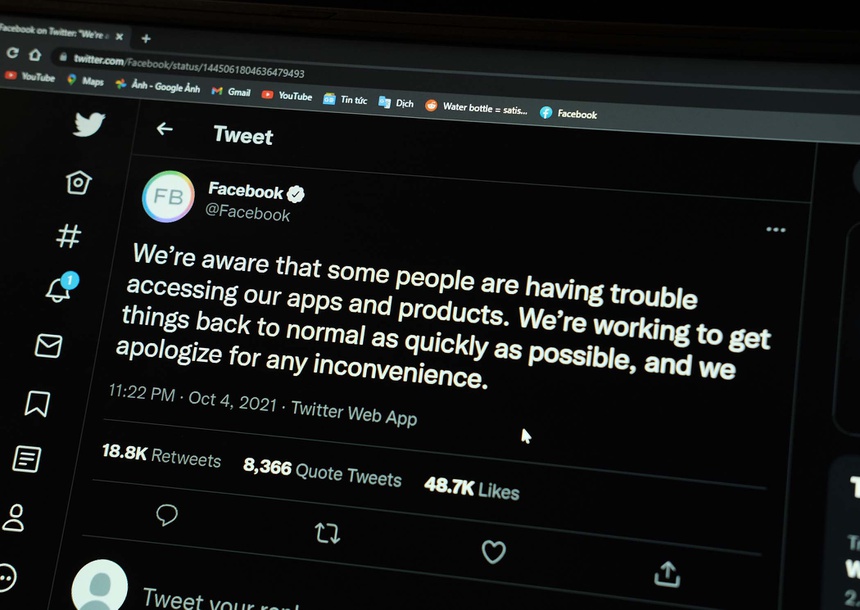 Tối 4/10, hàng loạt dịch vụ của Facebook, bao gồm nền tảng chính, Instagram, WhatsApp và Messenger đều không thể truy cập. Khi vào bằng máy tính, tŕnh duyệt hiện lỗi "This site can't be reached", trong khi vào bằng ứng dụng di động sẽ không thể cập nhật nội dung mới.
