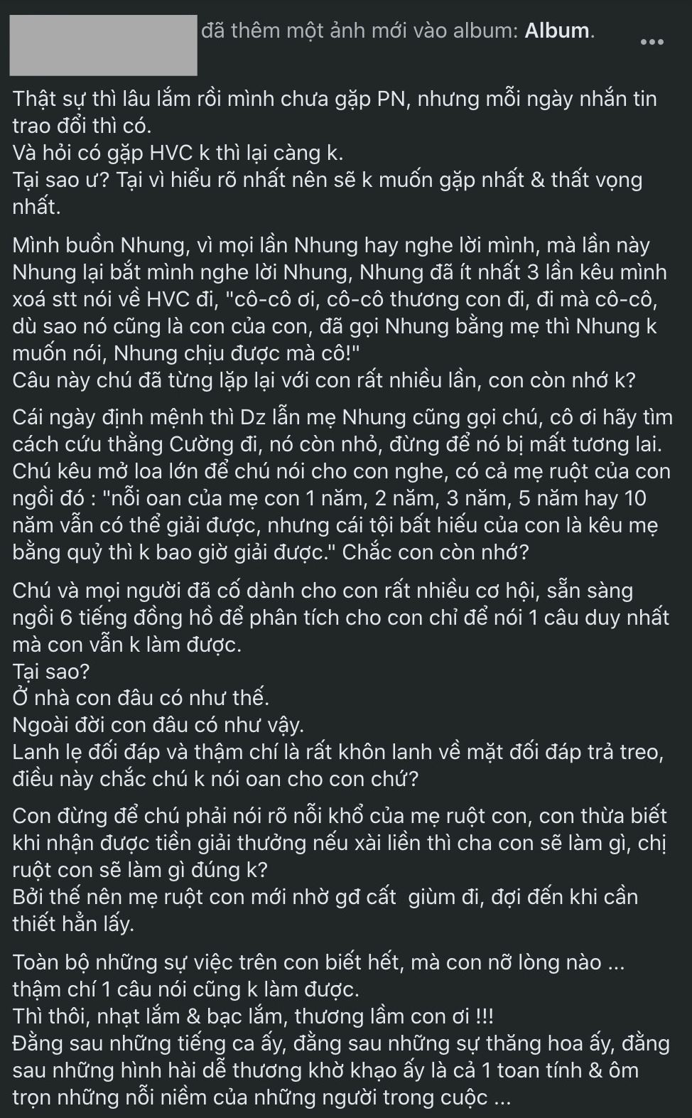 Bởi thế nên mẹ ruột con mới nhờ gia đình cất giùm đi, đợi đến khi cần thiết hẳn lấy. Toàn bộ những sự việc trên con biết hết, mà con nỡ lòng nào… thậm chí 1 câu nói cũng không làm được. Thì thôi, nhạt lắm & bạc lắm, thương lầm con ơi!!!, người thân cận với Phi Nhung chán nản.