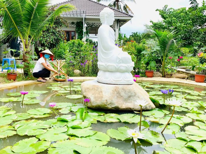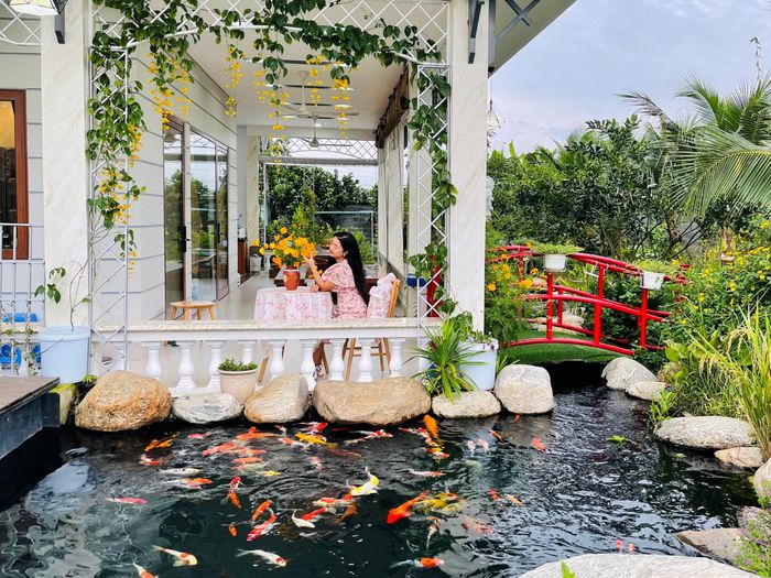 Ngoài vườn rau trái, chị Tưởng có hồ cá Koi và ao hoa súng để vừa làm đẹp cảnh quan, vừa góp phần điều hòa không khí luôn trong lành.