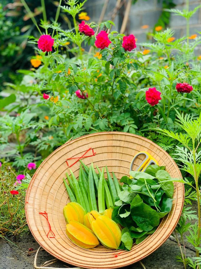Khu vườn của chị Tưởng hiện có một số cây ăn trái được thu hoạch như cam, khế, đu đủ, bưởi. Chị vừa trồng thêm xoài, vú sữa, mít, dừa. Rau củ chị có cà pháo, cà tím, đậu bắp, cải, dưa gang và rau thơm, cây gia vị. Không gian cũng ngập tràn nhiều loại hoa theo sở thích của nữ chủ nhân.