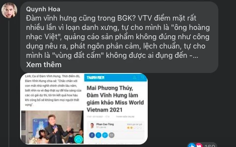 Kéo xuống các bài đăng trên fanpage này, hầu hết ở phần bình luận là những ý kiến bất bình, tẩy chay chương trình với lựa chọn sai lầm này. Lý do được đưa ra: “Bản thân Đàm Vĩnh Hưng còn chưa đẹp, sao lại làm giám khảo Miss World Vietnam?”.