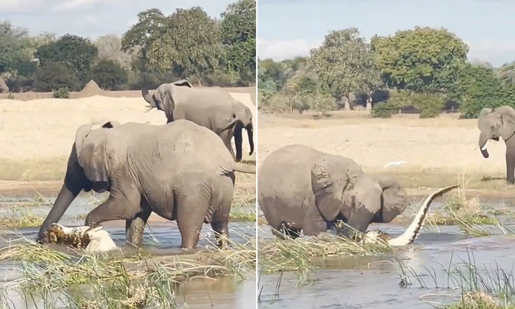 Khó chịu khi thấy cá sấu đến quá gần con, voi mẹ loại bỏ triệt để mối nguy hiểm bằng cách giẫm chết nó.