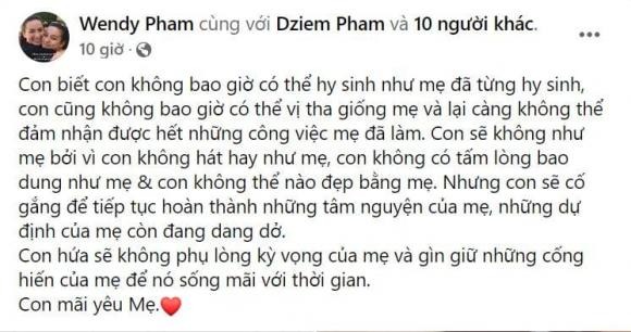 Cô chia sẻ lên trang cá nhân: "Con biết con không bao giờ có thể hy sinh như mẹ đã từng hy sinh. Con cũng không bao giờ có thể vị tha giống mẹ và lại càng không thể đảm nhận được hết những công việc mẹ đã làm. Con sẽ không như mẹ bởi vì con không hát hay như mẹ, con không có tấm lòng bao dung như mẹ và con không thể nào đẹp bằng mẹ. Nhưng con sẽ cố gắng để tiếp tục hoàn thành những tâm nguyện của mẹ, những dự định của mẹ còn đang dang dở. Con hứa sẽ không phụ lòng kỳ vọng của mẹ và gìn giữ những cống hiến của mẹ để nó sống mãi với thời gian. Con mãi yêu mẹ".