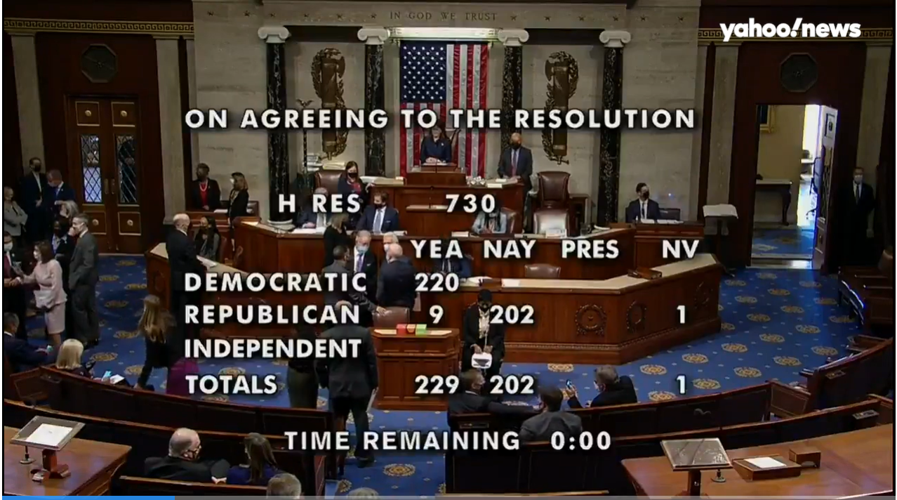 9 dân biểu thuộc đảng Cộng Hòa đã vì lợi ích quốc gia trên lợi ích đảng phái đã cùng 220 dân biểu đảng Dân Chủ bỏ phiếu thuận buộc tội Steve Bannon. Bước kế tiếp Ban Hành Pháp của của Quốc Hội sẽ cần một giấy tuyên pháp của tổng thống Joe Biden để tiến hành áp giải Steve Bannon nếu vẫn tiếp tục phản kháng trát hầu.