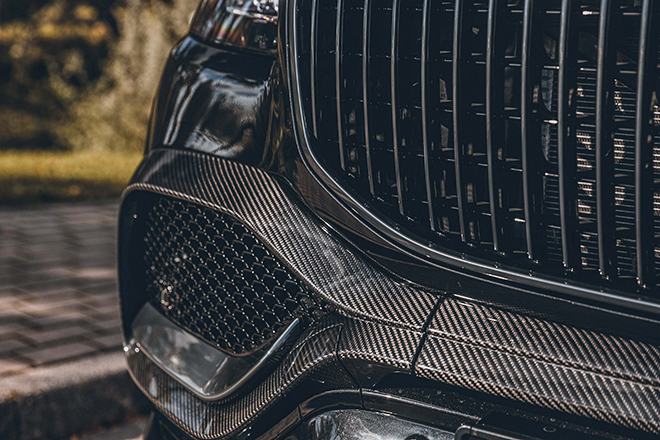 Gói độ của Brabus dành cho Mercedes-Maybach GLS 600 thay đổi không quá nhiều ở ngoại thất. Đầu tiên toàn bộ các chi tiết mạ chrome sáng được thay thế bằng màu xám nhằm tạo vẻ huyền bí cho chiếc SUV sang trọng. Phần cản trước được ốp viền làm từ chất liệu carbon xung quanh hốc hút gió, bổ sung thêm líp cản trước và bỏ đi chi tiết ốp cản mạ chrome nguyên bản của xe. Mặt ca-lăng tối màu đi kèm dòng chữ Brabus trên đỉnh thay cho chữ Maybach. Logo Mercedes trên nắp capo cũng được loại bỏ.