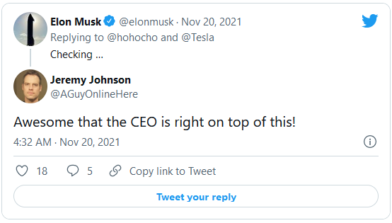 Một khách hàng của Tesla ở Hàn Quốc, Jaehwan Cho cũng gặp vấn đề trên và đã tweet cho ông Musk để thông báo. Như một nhân viên dịch vụ khách hàng chuyên nghiệp, ông Musk chỉ mất đúng 3 phút để trả lời lại dòng tweet của khách hàng này. Tuy vậy, vào thời điểm đó, ông Musk cũng không thể làm gì khác ngoài việc phản hồi cho biết, lời phàn nàn của khách hàng đã được ghi nhận.
