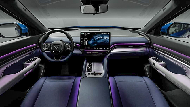 Bên trong nội thất xe VinFast VF e36 có vô-lăng hình chữ nhật bo tròn bốn góc tạo sự khác biệt so với VF e35. Xe không có cụm đồng hồ phía trước mà tích hợp vào màn hình giải trí trung tâm kích thước lớn ở chính giữa táp-lô và cabin của e36 chỉ có thêm cửa gió điều hoà cỡ lớn và cụm 4 phím số lái P-R-N-D đặt dọc, các nút bấm rườm rà đều bị loại bỏ để đem lại không gian tối giản nhất.