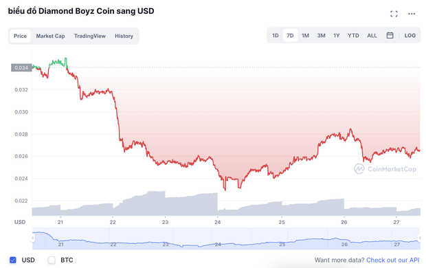 Dữ liệu từ CoinMarketCap ghi nhận, tối ngày 28/11, giá của đồng tiền mã hóa Diamond Boyz Coin ( DBZ ) của ông hoàng kim cương Johnny Đặng đã tăng nhẹ trở lại nhưng vẫn chỉ nằm ở mốc 0,027 USD.Mức giá giảm sâu khiến nhiều nhà đầu tư vào DBZ vỡ mộng, nhiều người cho biết đang đợi để "bơi vào bờ".