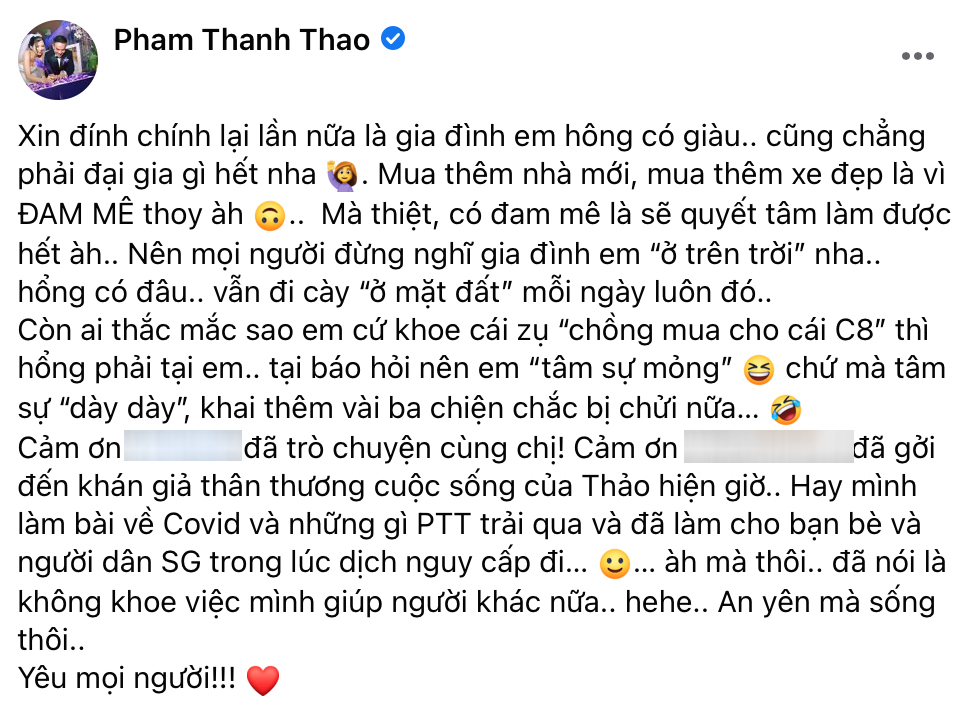 Trong bối cảnh Covid-19 diễn ra, Phạm Thanh Thảo đã có hoạt động nhân văn dành cho bà con ở Việt Nam. Tuy nhiên, với quan điểm sống an yên, cô không muốn khoe chi tiết về chuyện giúp người để mang lại danh tiếng cho bản thân. Trên mạng xã hội, cô thường xuyên khoe những khoảnh khắc về gia đình nhỏ, việc học hành của các con.