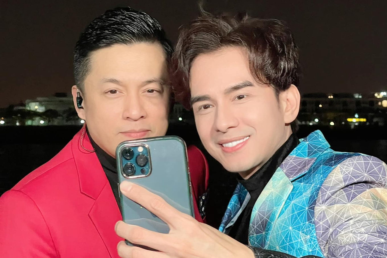 Đan Trường bên Lam Trường - đàn anh hơn hai tuổi - trong một đêm nhạc hồi tháng 2. Từng cạnh tranh trên sân khấu ca nhạc cuối thập niên 1990, sau hơn 20 năm, đôi ca sĩ giữ tình đồng nghiệp thân thiết, thường chạy show cùng nhau ở Mỹ.