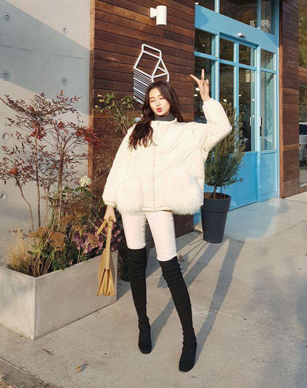 Thích sự tối giản, nàng có chọn trang phục màu trắng cùng boot đùi nhung đen là hoàn hảo.