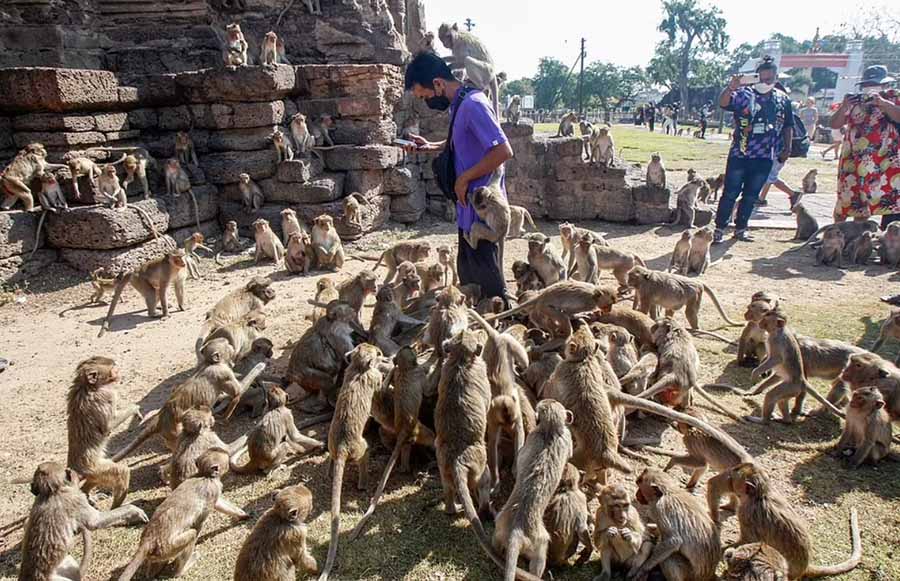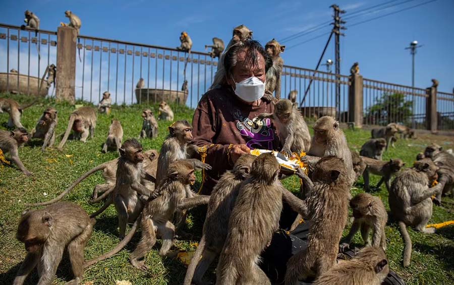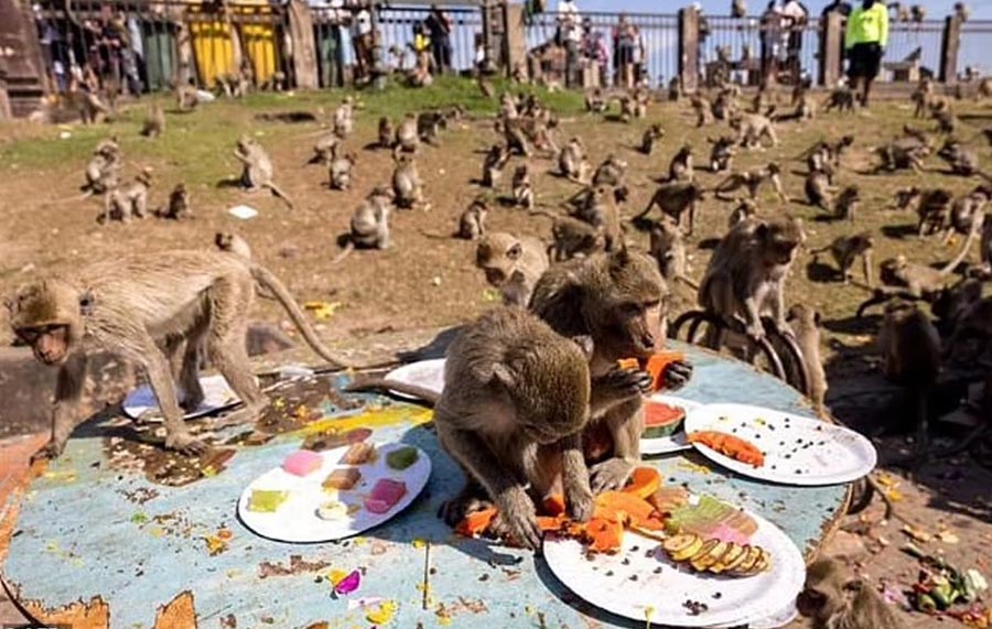 Người ta gọi đây là lễ hội “Monkey Buffet”. Do ảnh hưởng của dịch Covid-19, năm nay số lượng khỉ đói khát kéo tới lễ hội này rất đông, ước tính lên tới cả 1000 con. Chúng tràn xuống lòng đường, leo lên bàn, ngồi trên xe lăn chất đầy trái cây bên ngoài ngôi đền Pra Prang Sam Yod 800 năm tuổi của thị trấn.