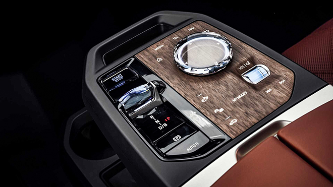 Bên trong khoang nội thất BMW iX mới là một sự đột phá về mặt thiết kế. Vô-lăng hình lục giác lần đầu tiên được áp dụng trên xe thương mại. Cụm điều khiển trung tâm sử dụng mặt kính có kích thước lớn nhất từng xuất hiện trên một chiếc BMW. Phím khởi động, cần số, núm tăng giảm âm lượng, núm xoay iDrive làm bằng kính trong suốt.